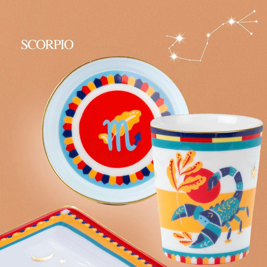 Cup with lid and saucer in porcelain from the Zodiac Vibe collection, inspired by the intense and mysterious personality of Scorpio. Intricate symbols and vivid details make this collection a captivating addition to any home.