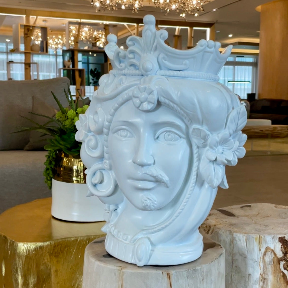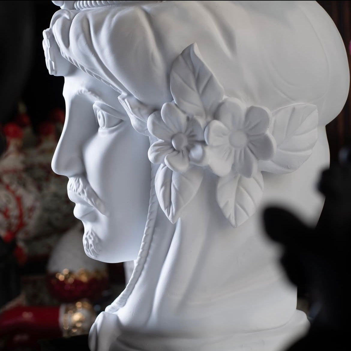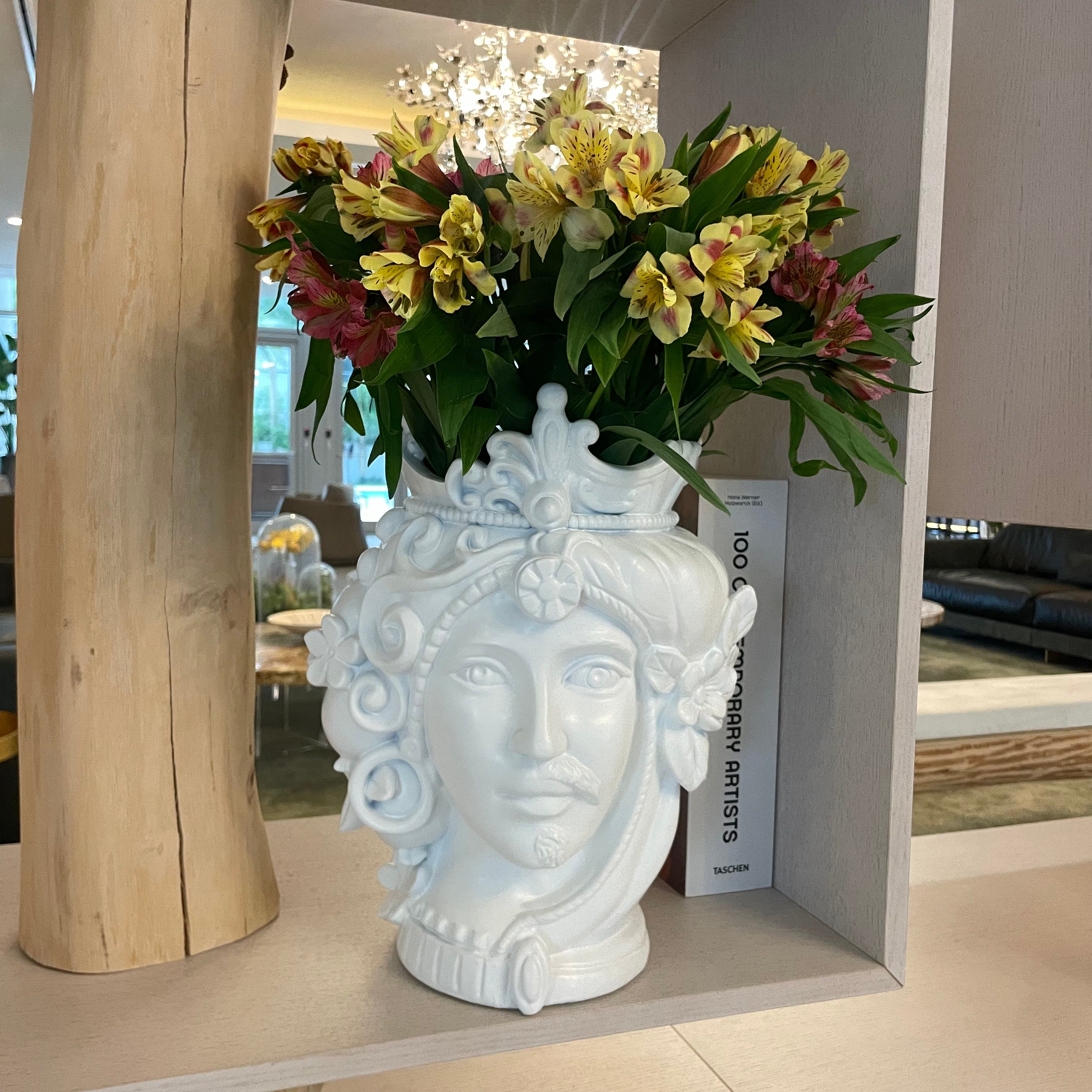 White decorative head couple from the Teste Matte collection, inspired by Sicilian art. These elegant sculptures make an excellent focal point for refined interiors.