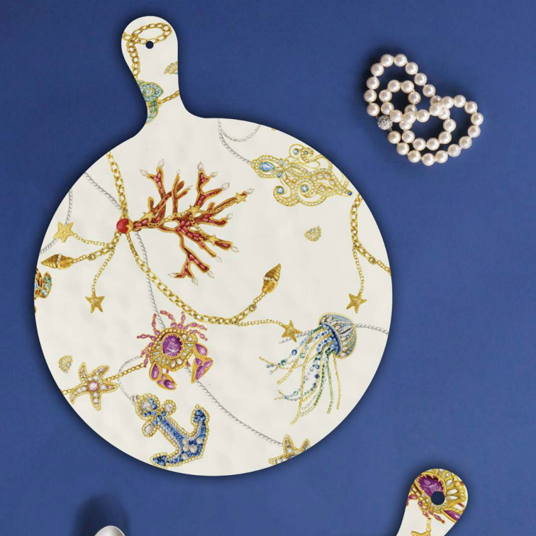Large Melamine Chopping Board from the collection dedicated to Portofino, one of the gems of the Mediterranean, a symbolic place of luxury, refinement and well-being. Precious jewels, pearls and jewels intertwine and transform into corals, fish and shells.