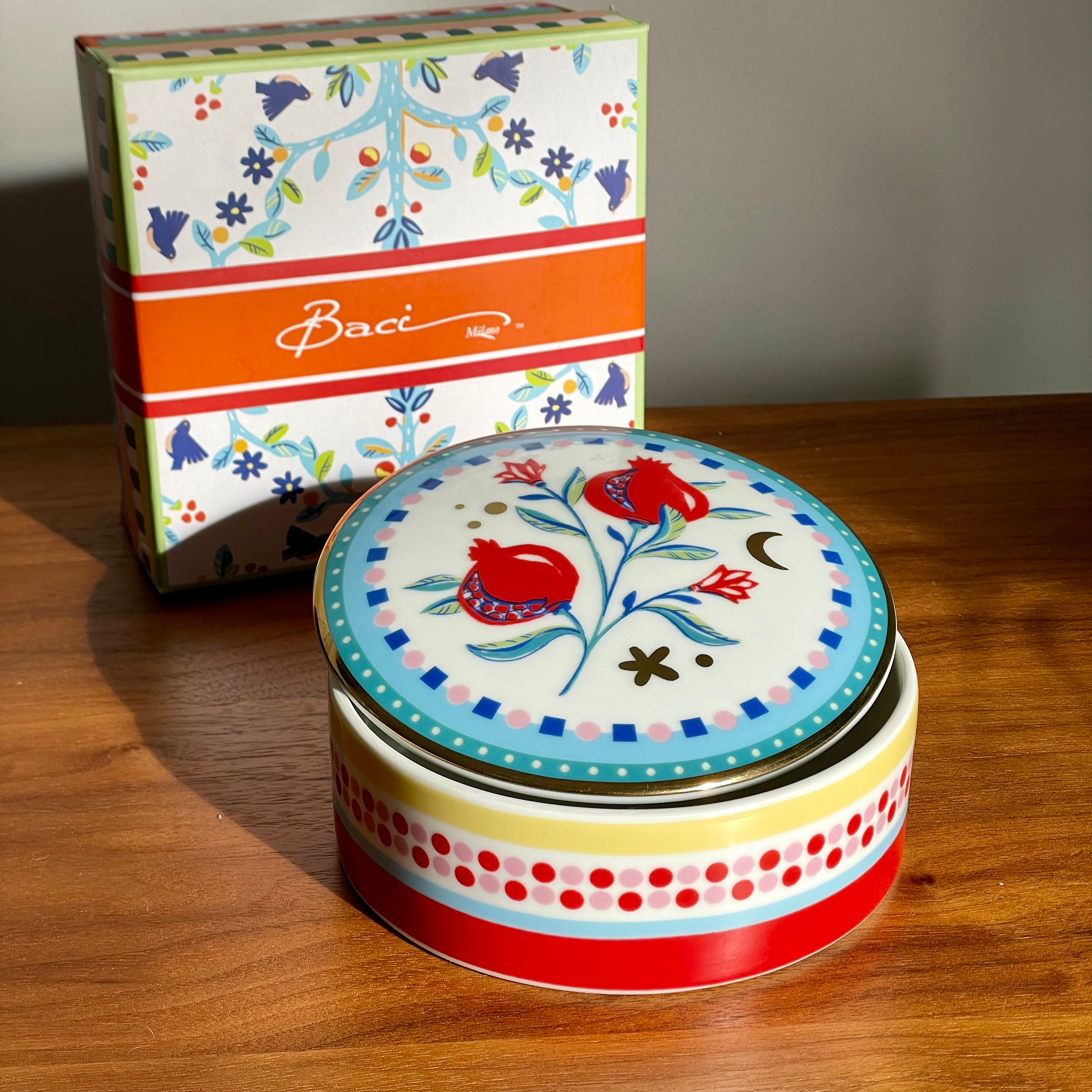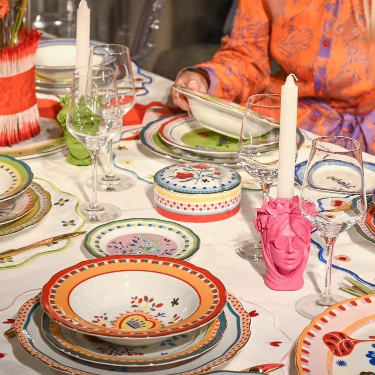 Round porcelain box from the Mamma Mia collection conceived with the aim of infusing vitality not only on the table, but also in every corner of the house through a kaleidoscope of colours, intriguing symbols, mysterious writings and compelling drawings.