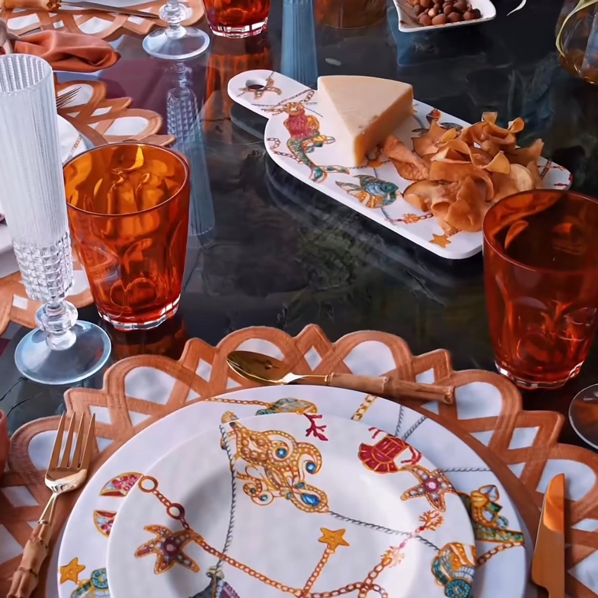 Dessert plate from the collection dedicated to Portofino, one of the gems of the Mediterranean, a symbolic place of luxury, refinement and well-being. Precious jewels, pearls and jewels intertwine and transform into corals, fish and shells.