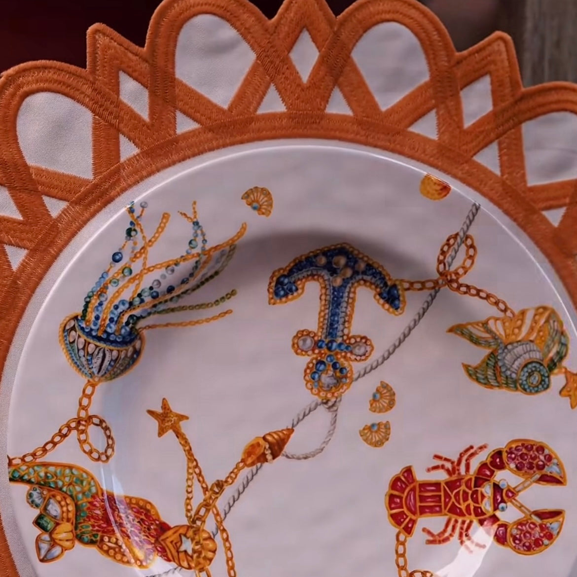 Melamine plates from the collection dedicated to Portofino, one of the gems of the Mediterranean, a symbolic place of luxury, refinement and well-being. Precious jewels, pearls and jewels intertwine and transform into corals, fish and shells.