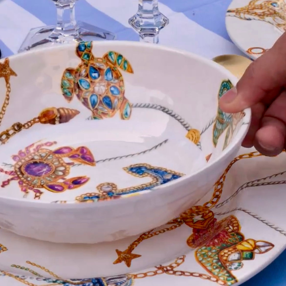 This set of 6 melamine soup bowls from Baci Milano's Portofino collection brings the refined elegance of the Italian Riviera to your table. Featuring precious jewels, pearls, corals, fish, and shells in intricate patterns, these bowls transform simple soups into elegant experiences.