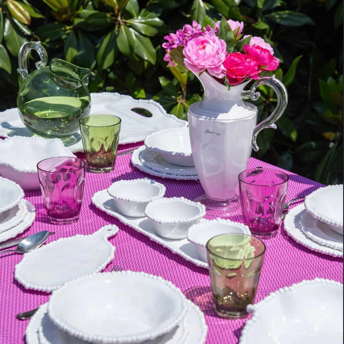 Inspired by the soothing calm of water, Baci Milano's Aqua collection exudes effortless elegance, perfect for al fresco dining or poolside gatherings. Each piece, crafted with sleek modern lines and soft hues, invites a sense of serenity and refinement to your table. With its understated design and durable construction, the Aqua collection offers the ideal balance between beauty and practicality.