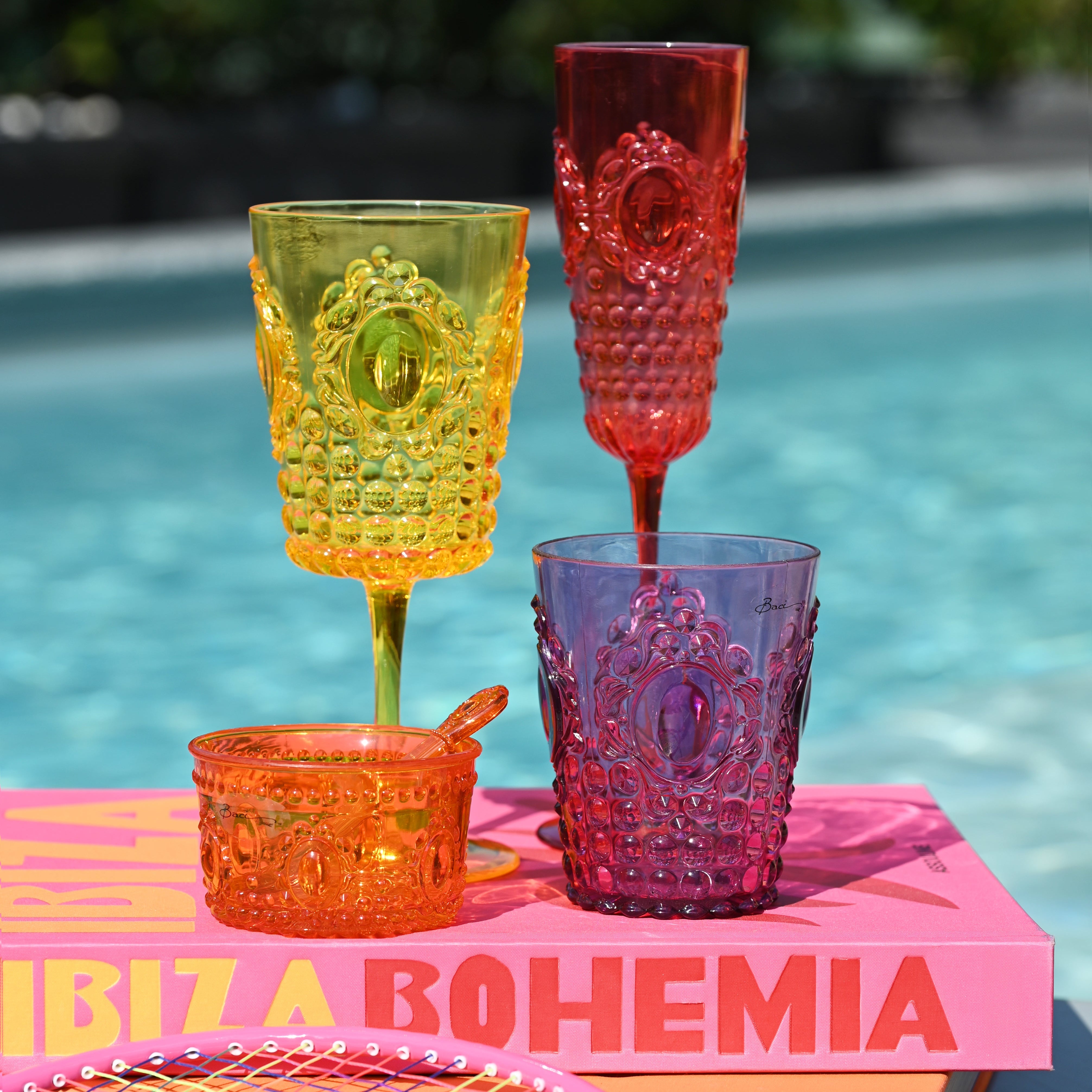 Explore the Baroque Rock Collection by Baci Milano, featuring acrylic drinkware, including acrylic wine glasses, tumblers, and flutes with elegant Italian designs.