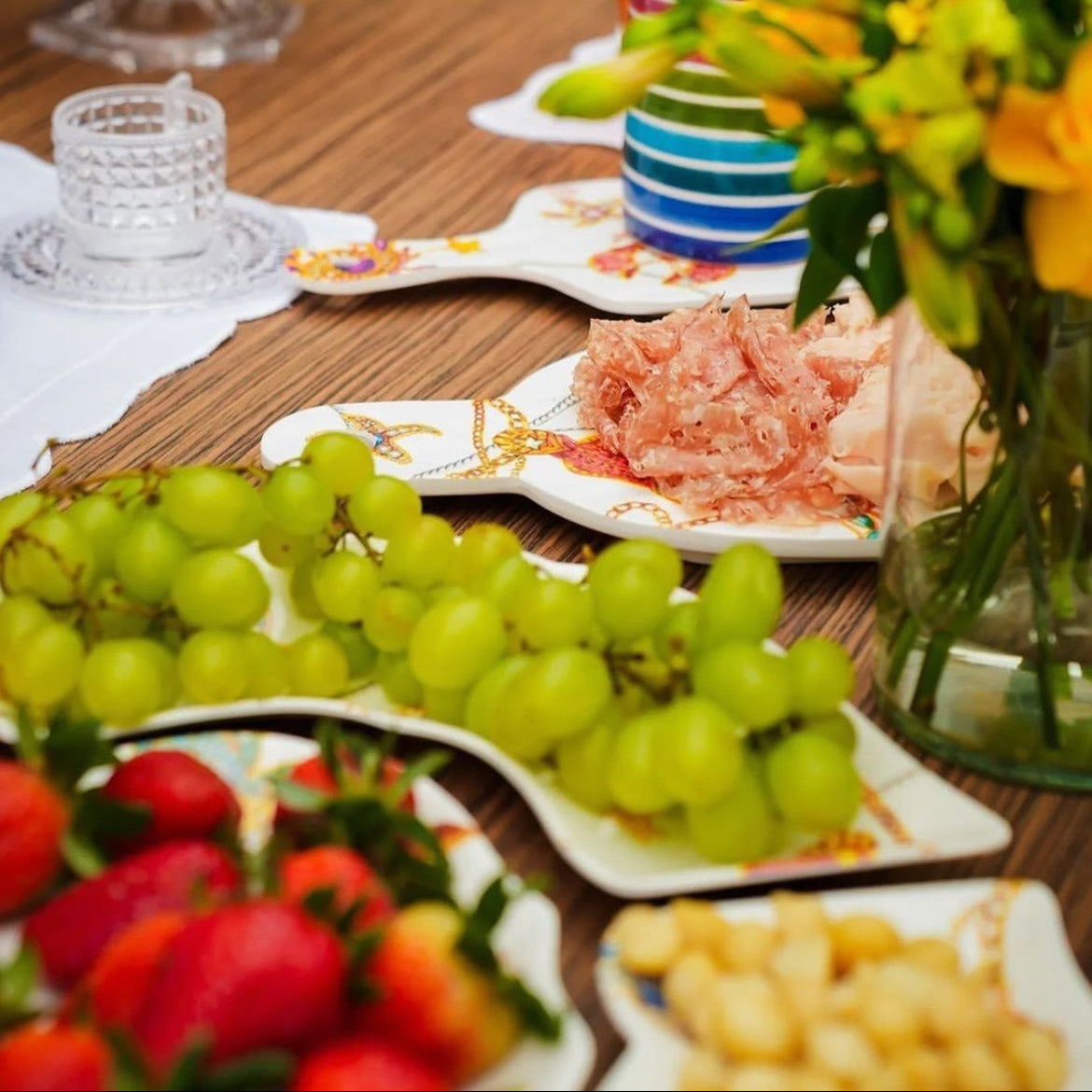 7-piece appetizer set in melamine from the collection dedicated to Portofino, one of the gems of the Mediterranean, a place symbolizing luxury, refinement and well-being. Precious jewels, pearls and jewels intertwine and transform into corals, fish and shells.