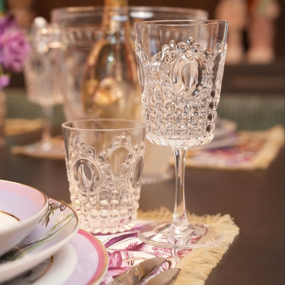 Explore the Baroque Rock Collection by Baci Milano, featuring acrylic drinkware, including acrylic wine glasses, tumblers, and flutes with elegant Italian designs.