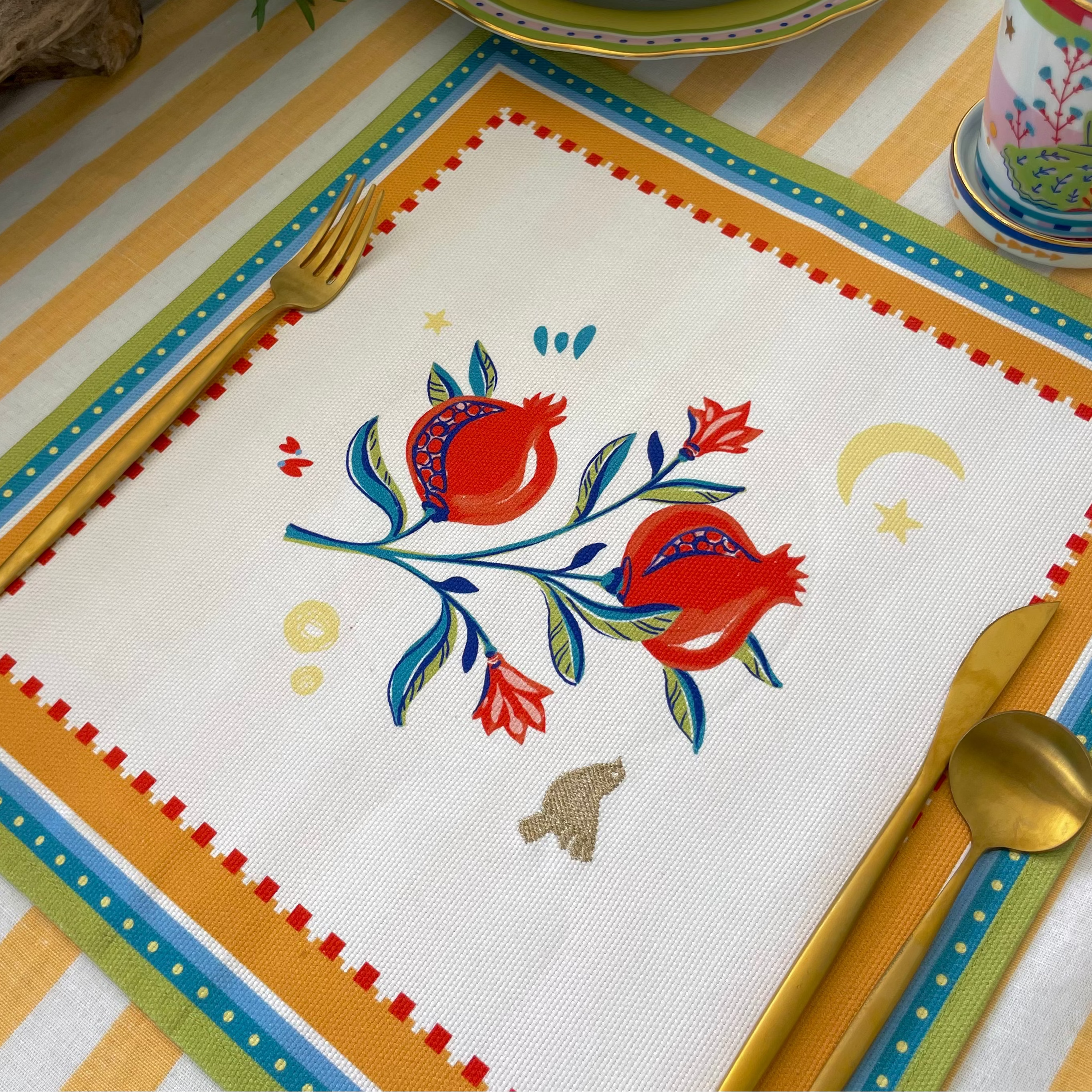 Square stain-resistant placemat from the Mamma Mia collection, adorned with a rich pomegranate-inspired design. Perfect for adding a Mediterranean charm to your table while protecting it from spills.